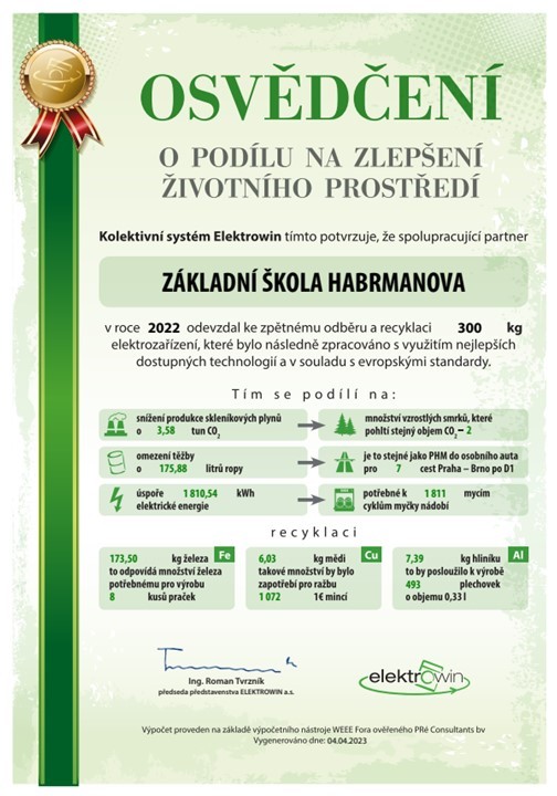 Díky obyvatelům se naše Základní škola Habrmanova může za rok 2022 pochlubit výsledky sběru vysloužilého elektrozařízení předaného ke zpětnému odběru společnosti Elektrowin o celkové hmotnosti 0,30 t. Každý obyvatel tak odevzdal průměrně kg spotřebičů. Ušetřili jsme tak spotřebu elektřiny a snížili produkci skleníkových plynů. Nespotřebovali jsme ropu, železnou rudu, měď a hliník, které jsou potřebné pro průmyslovou výrobu. Nahradili jsme je právě recyklací odevzdaných spotřebičů.