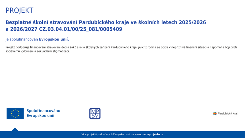 Bezplatné školní stravování Pardubického kraje ve školních letech 2025/2026 a 2026/2027 CZ.03.04.01/00/25_081/0005409