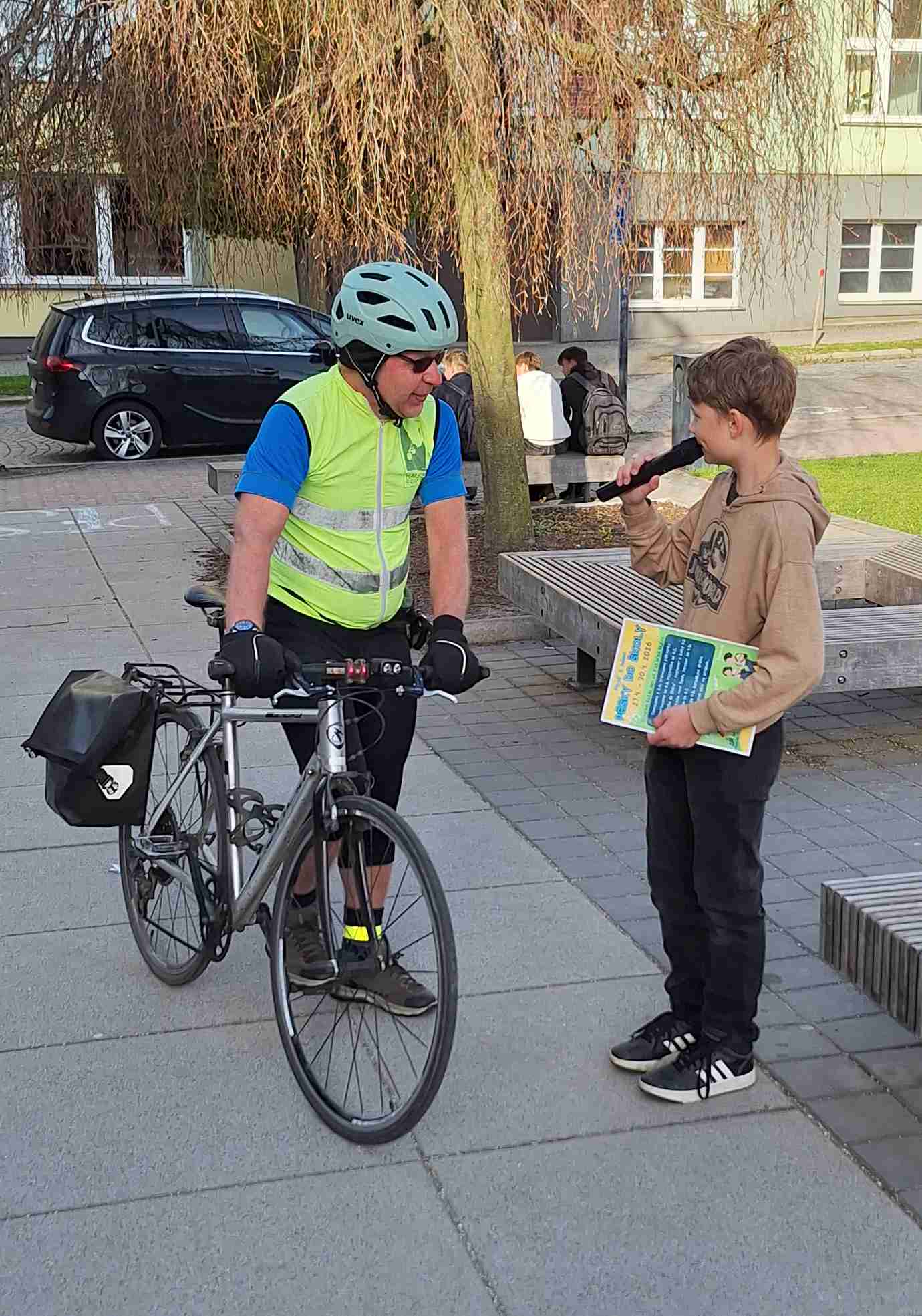 Zajímavým zpestřením programu byl také moderátor, který v průběhu celé akce vedl rozhovory se žáky i učiteli. Zaměřil se především na ty, kteří do školy nepřišli pěšky, ale přijeli na kole. Otázky směřovaly na správnou výbavu kola – například na používání helmy, světel či reflexních prvků.