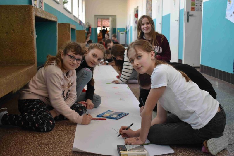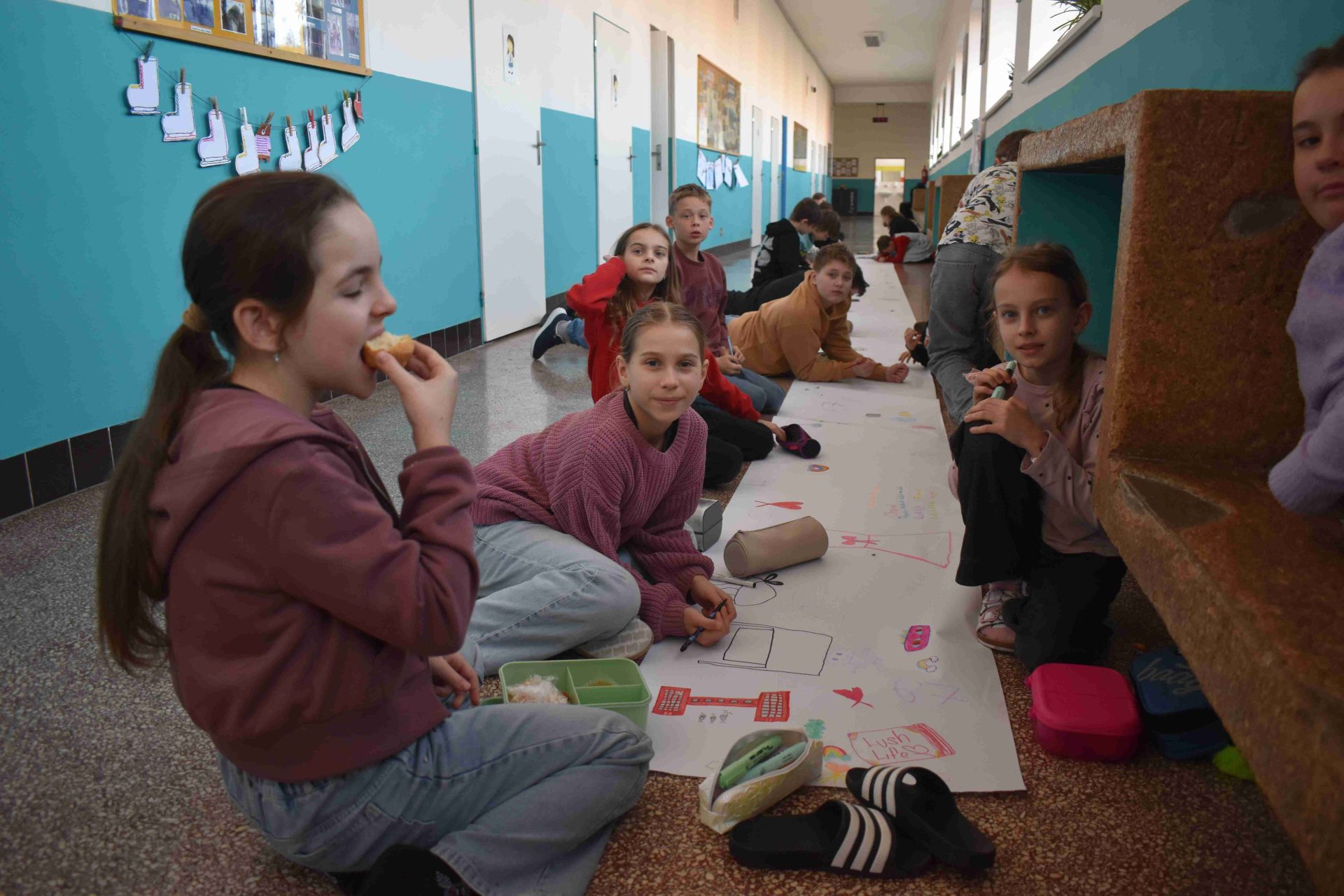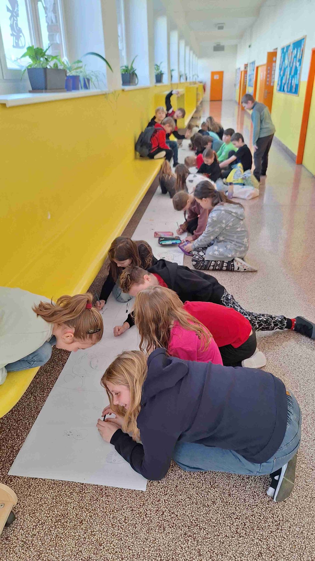 Čtvrtý den našeho projektu Týden pro Wellbeing se nesl v duchu kreativity a radosti z tvoření. Školní chodba se během přestávek proměnila v otevřený ateliér, kde mohli žáci 1. i 2. stupně společně kreslit na dlouhou papírovou roli.